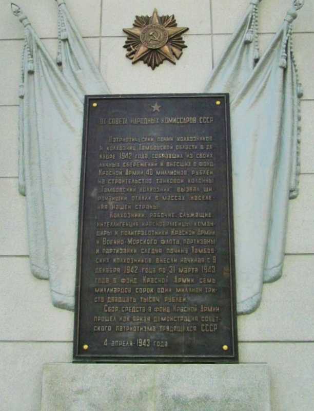 Сегодня украшением города Тамбова служит всемирно известный танк Т - 34, один из тех танков которые были закуплены на деньги собранные народом, из колонны названной «Тамбовский колхозник».